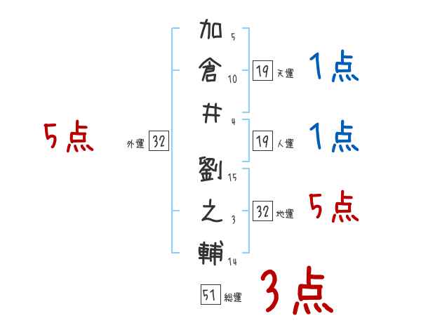 外運![]() | 加倉井劉之輔さんの外運は32画の5つ星!柔軟性があり成功する。チャンスが多く金運が良い。 生活面を象徴する運勢です。外部から受ける影響力を表し、結婚運、家庭運や職場、環境への順応性を表します。 |