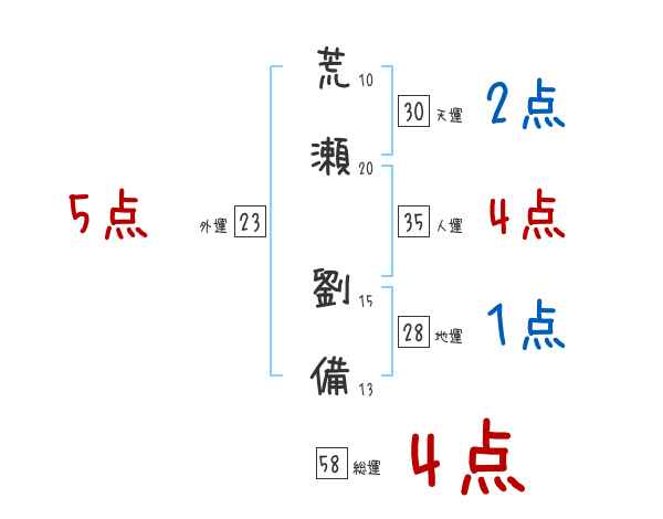 天運![]() | 荒瀬劉備さんの天運は30画の2つ星!浮き沈みの激しさに注意しましょう。 家系が持つ宿命的な運勢を表します。祖先から受け継いだ苗字ですので自分の力が及びません。家柄を象徴します。 |