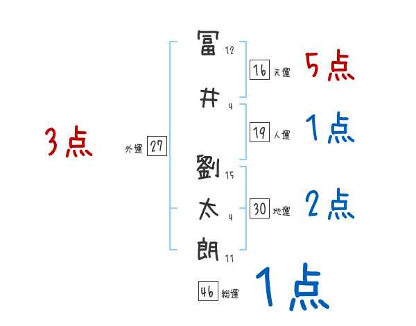 人運![]() | 冨井劉太朗さんの人運は19画の1つ星!優れた才能を持ちますが、協調性が足りないことも。周りの人と協力する事を意識しましょう。 性格や才能などを表す2番目に重要な運勢です。人間関係や協調性、社会的な成功に影響します。主に20歳から50歳ぐらいまでの中年期の運勢を表します。 |