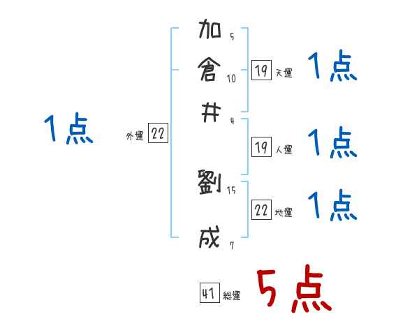 総運![]() | 加倉井劉成さんの総運は41画の5つ星!大志を抱き、目標に向かって実力を発揮し達成する。温和な性格。 あなたの人生を表す1番重要な運勢です。生涯を通じて影響する総合運となり、主に50歳以降の晩年期に影響を及ぼします。 |