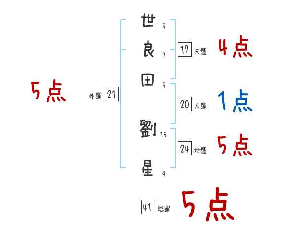 外運![]() | 世良田劉星さんの外運は21画の5つ星!統率力がある。独立し成功する。名誉を手に入れる。 生活面を象徴する運勢です。外部から受ける影響力を表し、結婚運、家庭運や職場、環境への順応性を表します。 |