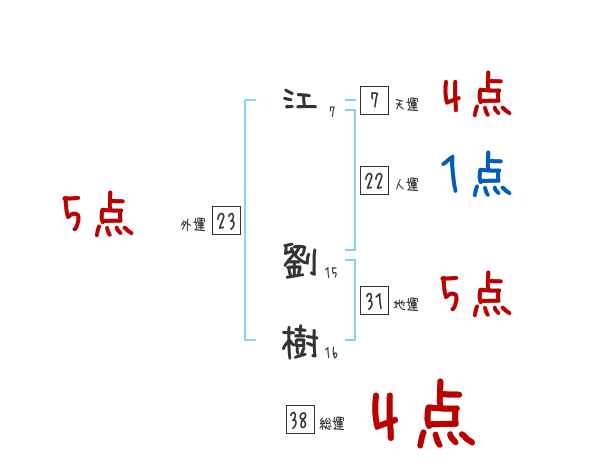外運![]() | 江劉樹さんの外運は23画の5つ星!想像力に優れ活力がある。一代で成功し名誉を手に入れる。 生活面を象徴する運勢です。外部から受ける影響力を表し、結婚運、家庭運や職場、環境への順応性を表します。 |