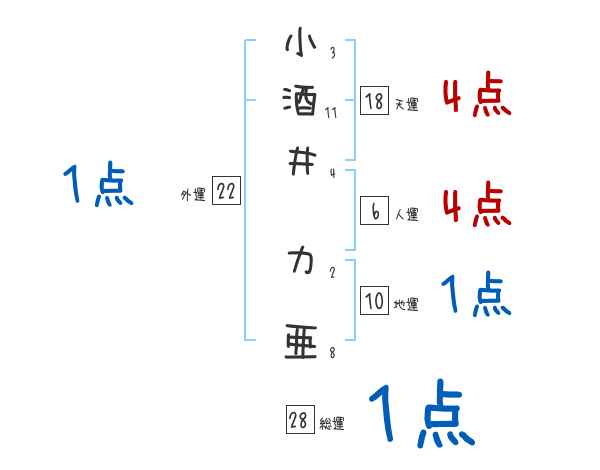 総運![]() | 小酒井力亜さんの総運は28画の1つ星!家庭環境に注意。スポーツで活躍できる能力があるかも。 あなたの人生を表す1番重要な運勢です。生涯を通じて影響する総合運となり、主に50歳以降の晩年期に影響を及ぼします。 |
