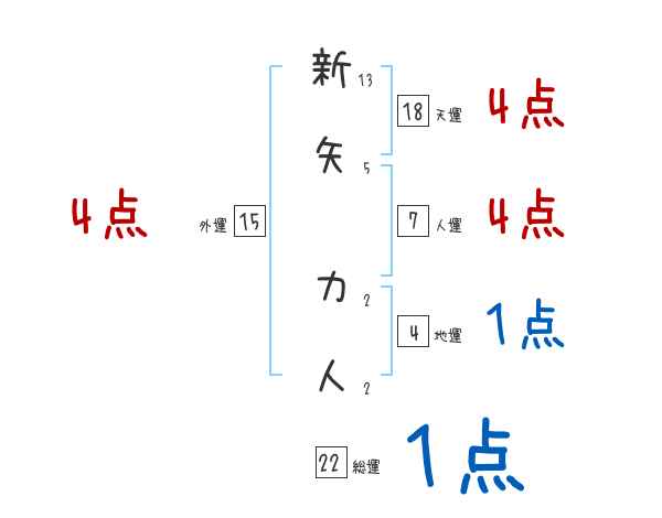 天運![]() | 新矢力人さんの天運は18画の4つ星!情熱的で剛気。忍耐力があり信頼される。 家系が持つ宿命的な運勢を表します。祖先から受け継いだ苗字ですので自分の力が及びません。家柄を象徴します。 |
