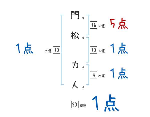 天運![]() | 門松力人さんの天運は16画の5つ星!人望が厚く大きく発展する。逆転成功が見える。 家系が持つ宿命的な運勢を表します。祖先から受け継いだ苗字ですので自分の力が及びません。家柄を象徴します。 |