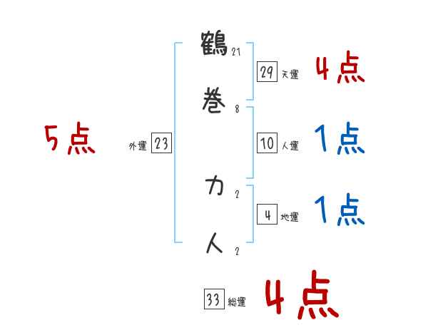 人運![]() | 鶴巻力人さんの人運は10画の1つ星!不安を感じやすい傾向。ストレスを抱えないように注意しましょう。 性格や才能などを表す2番目に重要な運勢です。人間関係や協調性、社会的な成功に影響します。主に20歳から50歳ぐらいまでの中年期の運勢を表します。 |