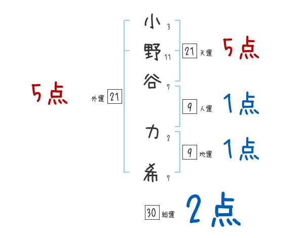 天運![]() | 小野谷力希さんの天運は21画の5つ星!統率力がある。独立し成功する。名誉を手に入れる。 家系が持つ宿命的な運勢を表します。祖先から受け継いだ苗字ですので自分の力が及びません。家柄を象徴します。 |