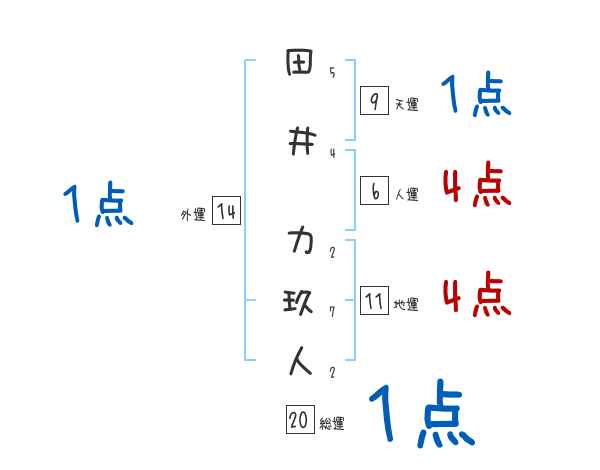 外運![]() | 田井力玖人さんの外運は14画の1つ星!人に対して優しいがストレスを溜め込みがち。人間関係のトラブルを避けるよう気をつけましょう。 生活面を象徴する運勢です。外部から受ける影響力を表し、結婚運、家庭運や職場、環境への順応性を表します。 |