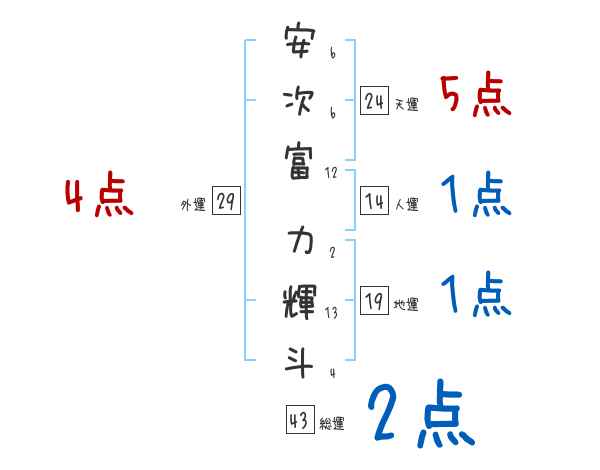 天運![]() | 安次富力輝斗さんの天運は24画の5つ星!家庭運が良く順調な人生。金運にも恵まれる。 家系が持つ宿命的な運勢を表します。祖先から受け継いだ苗字ですので自分の力が及びません。家柄を象徴します。 |