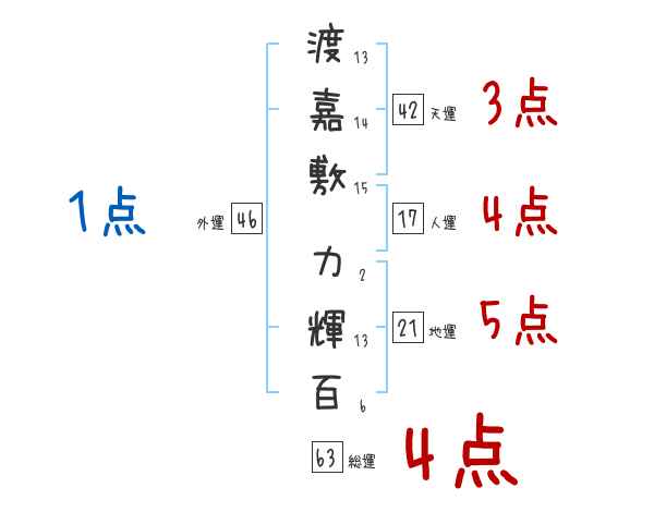 総運![]() | 渡嘉敷力輝百さんの総運は63画の4つ星!家庭運がよく順調な生活。温和な性格。 あなたの人生を表す1番重要な運勢です。生涯を通じて影響する総合運となり、主に50歳以降の晩年期に影響を及ぼします。 |