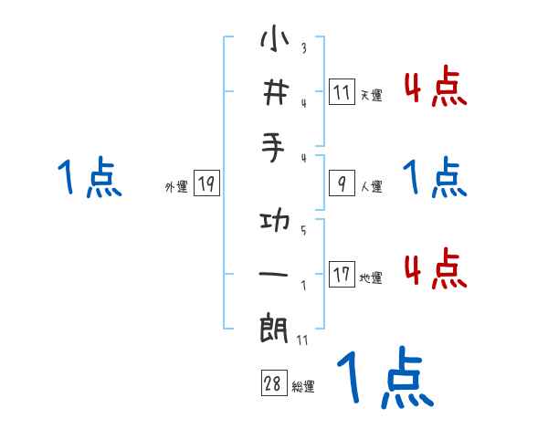 天運![]() | 小井手功一朗さんの天運は11画の4つ星!着実に富や地位を得る幸運な人生。 家系が持つ宿命的な運勢を表します。祖先から受け継いだ苗字ですので自分の力が及びません。家柄を象徴します。 |
