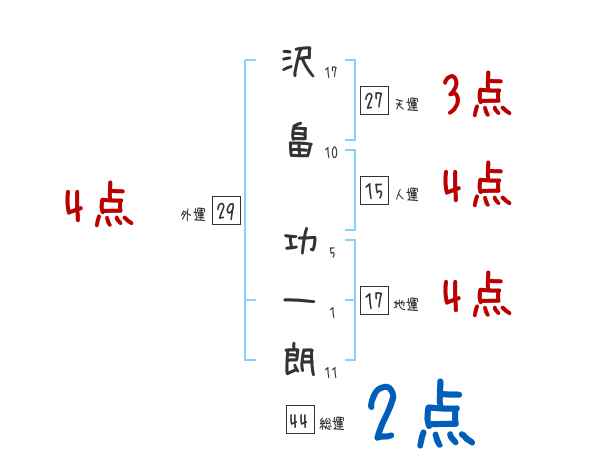 総運![]() | 沢畠功一朗さんの総運は44画の2つ星!誠実で慎重な性格。物事を考えすぎないように注意しましょう。 あなたの人生を表す1番重要な運勢です。生涯を通じて影響する総合運となり、主に50歳以降の晩年期に影響を及ぼします。 |