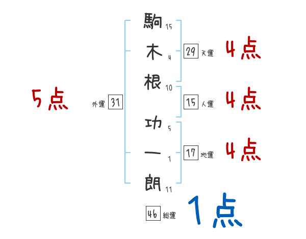 天運![]() | 駒木根功一朗さんの天運は29画の4つ星!完全主義で才能がある。厳格な心の持ち主。 家系が持つ宿命的な運勢を表します。祖先から受け継いだ苗字ですので自分の力が及びません。家柄を象徴します。 |