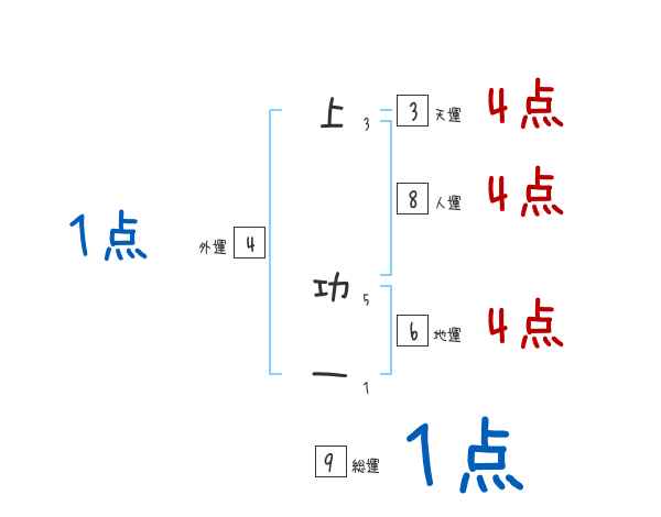 天運![]() | 上功一さんの天運は3画の4つ星!活動的で才能に恵まれ、多くの信頼を得る。希望に満ち成長する。 家系が持つ宿命的な運勢を表します。祖先から受け継いだ苗字ですので自分の力が及びません。家柄を象徴します。 |