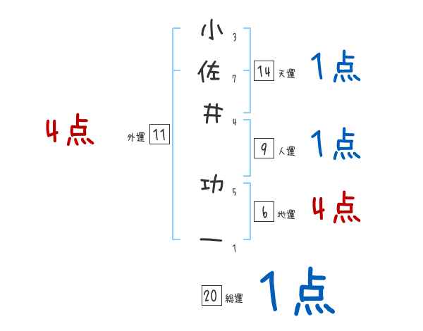 天運![]() | 小佐井功一さんの天運は14画の1つ星!人に対して優しいがストレスを溜め込みがち。人間関係のトラブルを避けるよう気をつけましょう。 家系が持つ宿命的な運勢を表します。祖先から受け継いだ苗字ですので自分の力が及びません。家柄を象徴します。 |