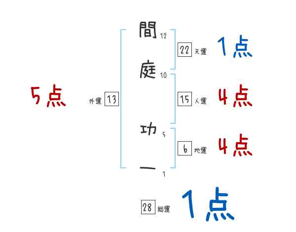 総運![]() | 間庭功一さんの総運は28画の1つ星!家庭環境に注意。スポーツで活躍できる能力があるかも。 あなたの人生を表す1番重要な運勢です。生涯を通じて影響する総合運となり、主に50歳以降の晩年期に影響を及ぼします。 |