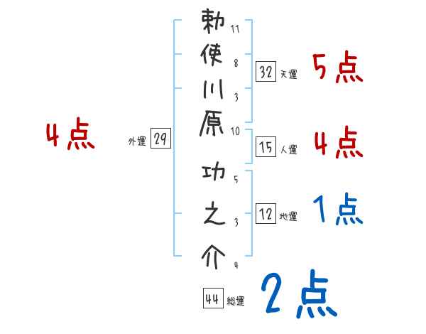 天運![]() | 勅使川原功之介さんの天運は32画の5つ星!柔軟性があり成功する。チャンスが多く金運が良い。 家系が持つ宿命的な運勢を表します。祖先から受け継いだ苗字ですので自分の力が及びません。家柄を象徴します。 |