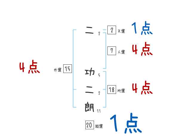 天運![]() | 二功二朗さんの天運は2画の1つ星!優しいですが積極性や意思の強さに欠ける傾向があります。家庭環境の乱れに注意しましょう。 家系が持つ宿命的な運勢を表します。祖先から受け継いだ苗字ですので自分の力が及びません。家柄を象徴します。 |