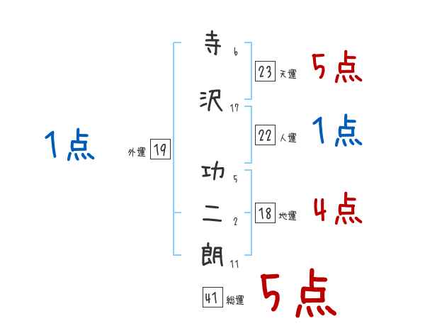 天運![]() | 寺沢功二朗さんの天運は23画の5つ星!想像力に優れ活力がある。一代で成功し名誉を手に入れる。 家系が持つ宿命的な運勢を表します。祖先から受け継いだ苗字ですので自分の力が及びません。家柄を象徴します。 |