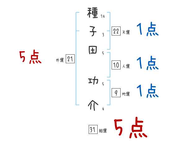 総運![]() | 種子田功介さんの総運は31画の5つ星!社交性があり判断力に優れる。順風満帆な人生で円満な生活。 あなたの人生を表す1番重要な運勢です。生涯を通じて影響する総合運となり、主に50歳以降の晩年期に影響を及ぼします。 |