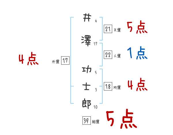 外運![]() | 井澤功士郎さんの外運は17画の4つ星!積極的な行動力。地位を気づき財産を手に入れる。純粋な心と直感力。 生活面を象徴する運勢です。外部から受ける影響力を表し、結婚運、家庭運や職場、環境への順応性を表します。 |