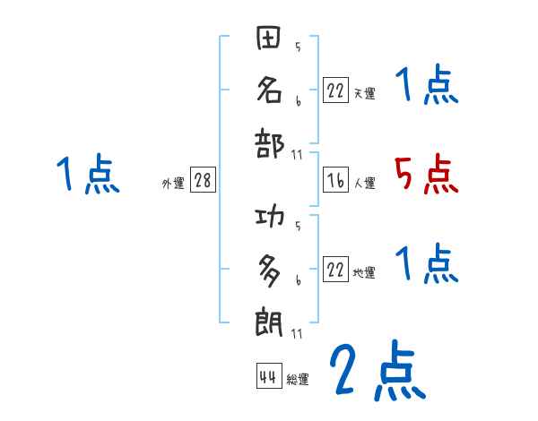 人運![]() | 田名部功多朗さんの人運は16画の5つ星!人望が厚く大きく発展する。逆転成功が見える。 性格や才能などを表す2番目に重要な運勢です。人間関係や協調性、社会的な成功に影響します。主に20歳から50歳ぐらいまでの中年期の運勢を表します。 |