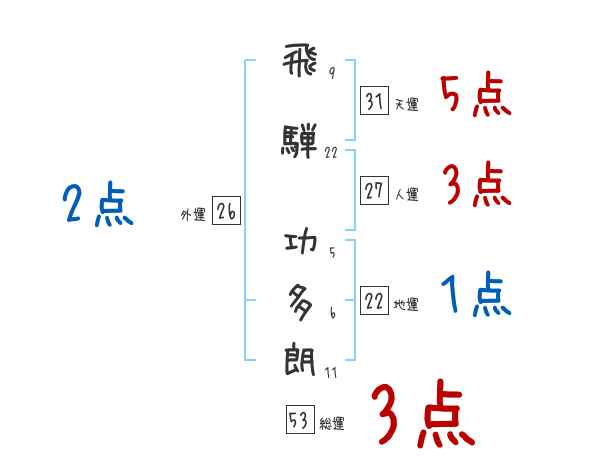 天運![]() | 飛騨功多朗さんの天運は31画の5つ星!社交性があり判断力に優れる。順風満帆な人生で円満な生活。 家系が持つ宿命的な運勢を表します。祖先から受け継いだ苗字ですので自分の力が及びません。家柄を象徴します。 |