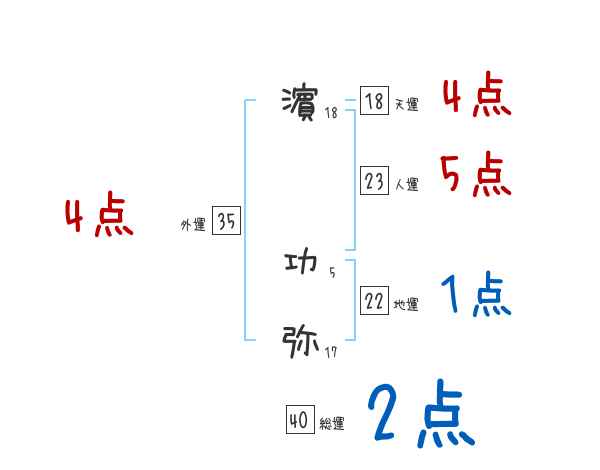 外運![]() | 濵功弥さんの外運は35画の4つ星!温厚な性格で感受性が高い。穏和な性格で人望が厚い。 生活面を象徴する運勢です。外部から受ける影響力を表し、結婚運、家庭運や職場、環境への順応性を表します。 |