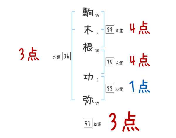 外運![]() | 駒木根功弥さんの外運は36画の3つ星!先見性が豊かです。多少神経質で苦労することも。 生活面を象徴する運勢です。外部から受ける影響力を表し、結婚運、家庭運や職場、環境への順応性を表します。 |