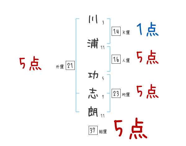 外運![]() | 川浦功志朗さんの外運は21画の5つ星!統率力がある。独立し成功する。名誉を手に入れる。 生活面を象徴する運勢です。外部から受ける影響力を表し、結婚運、家庭運や職場、環境への順応性を表します。 |