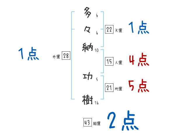 総運![]() | 多々納功樹さんの総運は43画の2つ星!頑固な性格で独立心が強いかも。やや非現実的で浪費に注意しましょう。 あなたの人生を表す1番重要な運勢です。生涯を通じて影響する総合運となり、主に50歳以降の晩年期に影響を及ぼします。 |