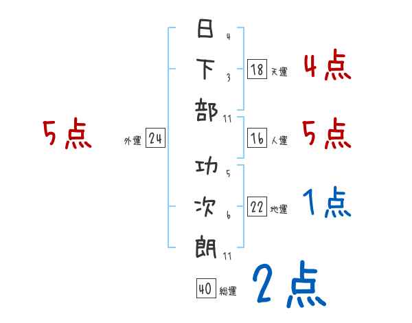 天運![]() | 日下部功次朗さんの天運は18画の4つ星!情熱的で剛気。忍耐力があり信頼される。 家系が持つ宿命的な運勢を表します。祖先から受け継いだ苗字ですので自分の力が及びません。家柄を象徴します。 |