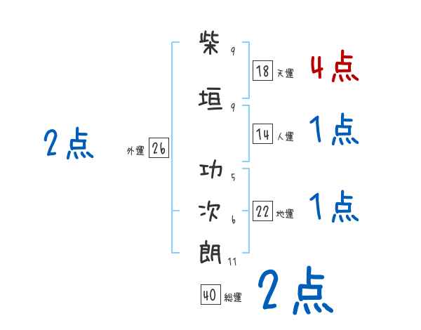 天運![]() | 柴垣功次朗さんの天運は18画の4つ星!情熱的で剛気。忍耐力があり信頼される。 家系が持つ宿命的な運勢を表します。祖先から受け継いだ苗字ですので自分の力が及びません。家柄を象徴します。 |