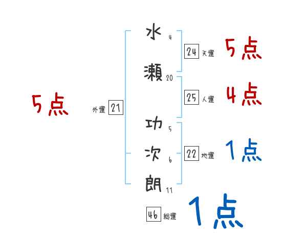 天運![]() | 水瀬功次朗さんの天運は24画の5つ星!家庭運が良く順調な人生。金運にも恵まれる。 家系が持つ宿命的な運勢を表します。祖先から受け継いだ苗字ですので自分の力が及びません。家柄を象徴します。 |