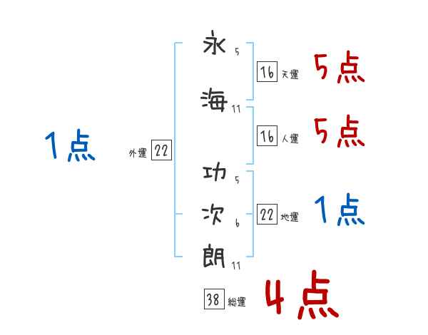 天運![]() | 永海功次朗さんの天運は16画の5つ星!人望が厚く大きく発展する。逆転成功が見える。 家系が持つ宿命的な運勢を表します。祖先から受け継いだ苗字ですので自分の力が及びません。家柄を象徴します。 |