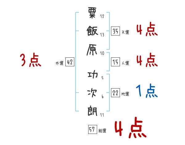 外運![]() | 粟飯原功次朗さんの外運は42画の3つ星!病気に注意。多芸であるが消極的でおとなしい。 生活面を象徴する運勢です。外部から受ける影響力を表し、結婚運、家庭運や職場、環境への順応性を表します。 |
