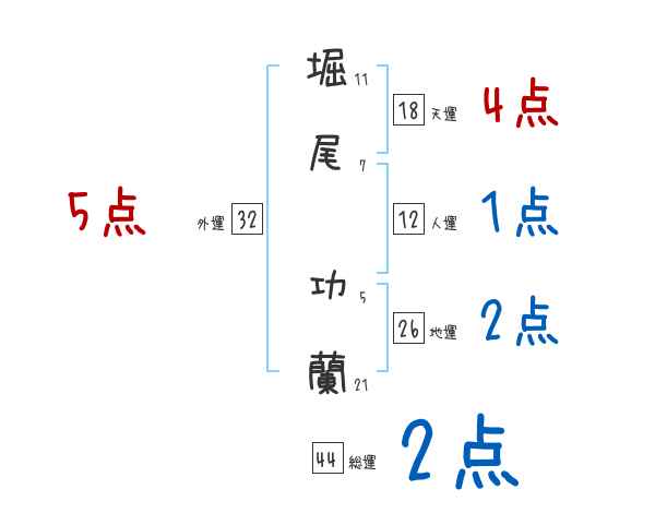 外運![]() | 堀尾功蘭さんの外運は32画の5つ星!柔軟性があり成功する。チャンスが多く金運が良い。 生活面を象徴する運勢です。外部から受ける影響力を表し、結婚運、家庭運や職場、環境への順応性を表します。 |