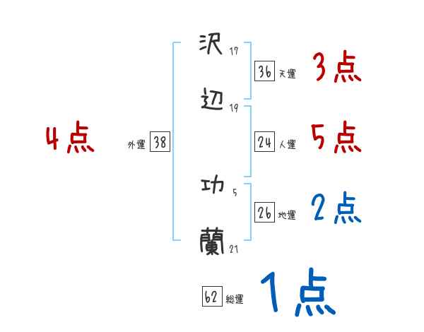 天運![]() | 沢辺功蘭さんの天運は36画の3つ星!先見性が豊かです。多少神経質で苦労することも。 家系が持つ宿命的な運勢を表します。祖先から受け継いだ苗字ですので自分の力が及びません。家柄を象徴します。 |