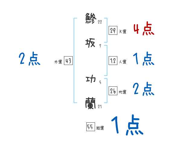 天運![]() | 鯵坂功蘭さんの天運は29画の4つ星!完全主義で才能がある。厳格な心の持ち主。 家系が持つ宿命的な運勢を表します。祖先から受け継いだ苗字ですので自分の力が及びません。家柄を象徴します。 |
