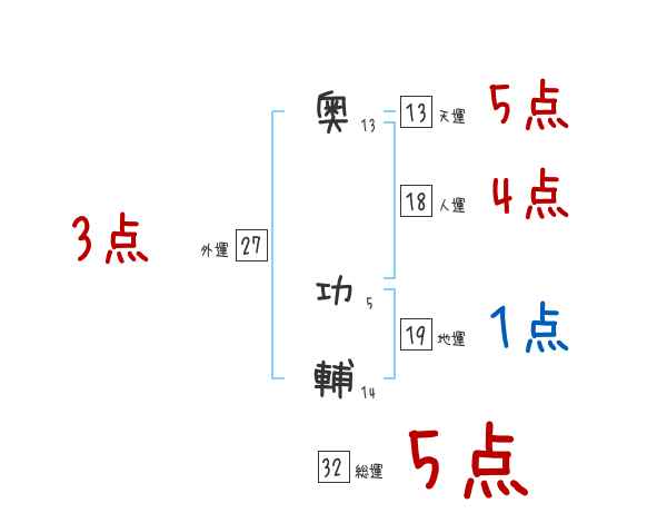 天運![]() | 奥功輔さんの天運は13画の5つ星!才能に恵まれ人気がある。名声を手に入れる。円満な人生。 家系が持つ宿命的な運勢を表します。祖先から受け継いだ苗字ですので自分の力が及びません。家柄を象徴します。 |