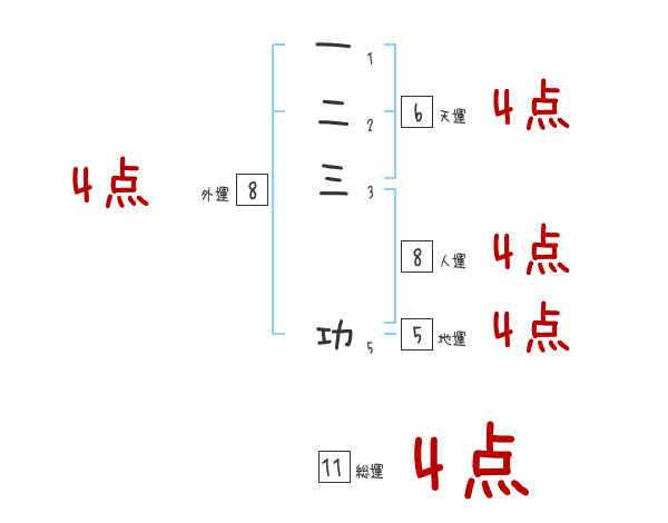 天運![]() | 一二三功さんの天運は6画の4つ星!慎重な努力家で信頼を得る。誠実な精神で向上心に優れる。 家系が持つ宿命的な運勢を表します。祖先から受け継いだ苗字ですので自分の力が及びません。家柄を象徴します。 |