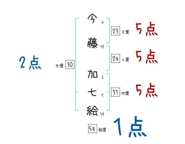 総運![]() | 今藤加七絵さんの総運は54画の1つ星!トラブルが多いかも。周りをよく見て協調して過ごしましょう。 あなたの人生を表す1番重要な運勢です。生涯を通じて影響する総合運となり、主に50歳以降の晩年期に影響を及ぼします。 |