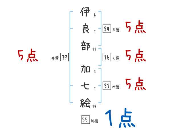 人運![]() | 伊良部加七絵さんの人運は16画の5つ星!人望が厚く大きく発展する。逆転成功が見える。 性格や才能などを表す2番目に重要な運勢です。人間関係や協調性、社会的な成功に影響します。主に20歳から50歳ぐらいまでの中年期の運勢を表します。 |
