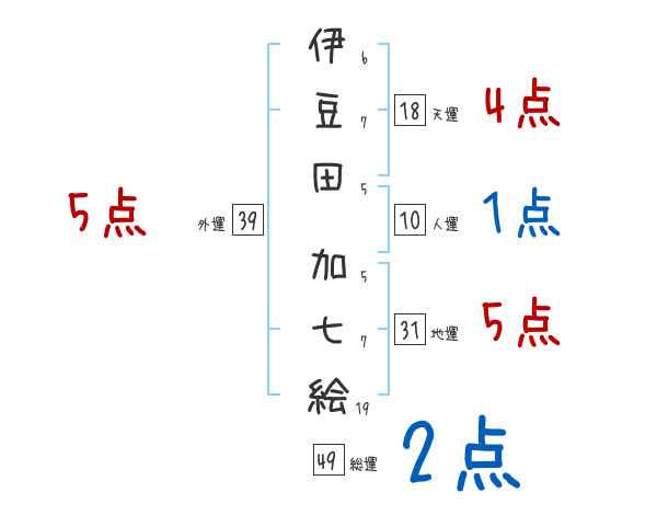 外運![]() | 伊豆田加七絵さんの外運は39画の5つ星!社交性に優れ人望が厚い。人の上に立ち成功する。 生活面を象徴する運勢です。外部から受ける影響力を表し、結婚運、家庭運や職場、環境への順応性を表します。 |