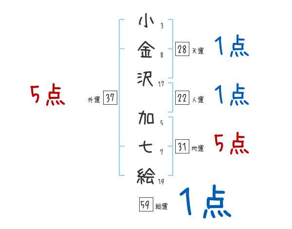 総運![]() | 小金沢加七絵さんの総運は59画の1つ星!意志の弱さであきらめることが多いかも。粘り強さが必要。 あなたの人生を表す1番重要な運勢です。生涯を通じて影響する総合運となり、主に50歳以降の晩年期に影響を及ぼします。 |