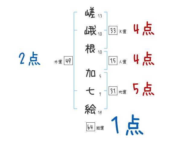 天運![]() | 嵯峨根加七絵さんの天運は33画の4つ星!権力志向でプライドが高い。勇気があり運を切り開き成功する。 家系が持つ宿命的な運勢を表します。祖先から受け継いだ苗字ですので自分の力が及びません。家柄を象徴します。 |
