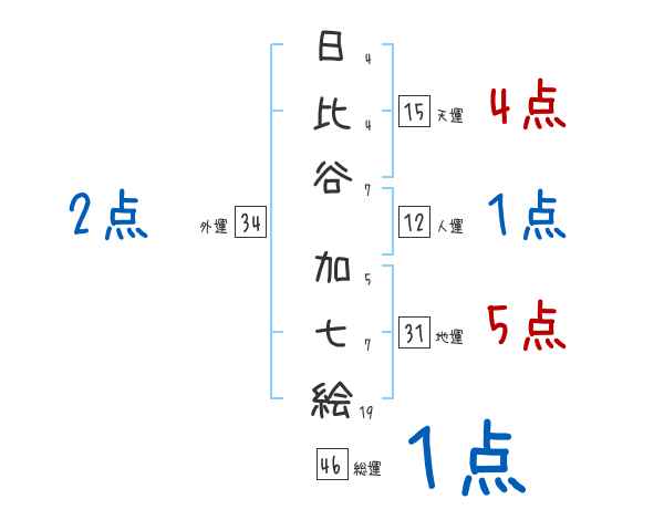 外運![]() | 日比谷加七絵さんの外運は34画の2つ星!独創性に優れるが、自尊心が強く災難に注意しましょう。 生活面を象徴する運勢です。外部から受ける影響力を表し、結婚運、家庭運や職場、環境への順応性を表します。 |