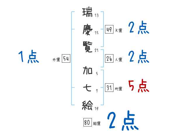 天運![]() | 瑞慶覧加七絵さんの天運は49画の2つ星!不安定な性格で明暗がある人生。周りの人には支援されやすい。 家系が持つ宿命的な運勢を表します。祖先から受け継いだ苗字ですので自分の力が及びません。家柄を象徴します。 |