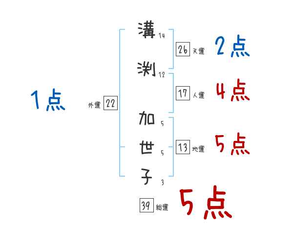 総運![]() | 溝渕加世子さんの総運は39画の5つ星!社交性に優れ人望が厚い。人の上に立ち成功する。 あなたの人生を表す1番重要な運勢です。生涯を通じて影響する総合運となり、主に50歳以降の晩年期に影響を及ぼします。 |