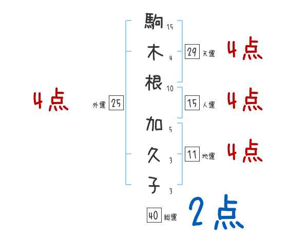 天運![]() | 駒木根加久子さんの天運は29画の4つ星!完全主義で才能がある。厳格な心の持ち主。 家系が持つ宿命的な運勢を表します。祖先から受け継いだ苗字ですので自分の力が及びません。家柄を象徴します。 |